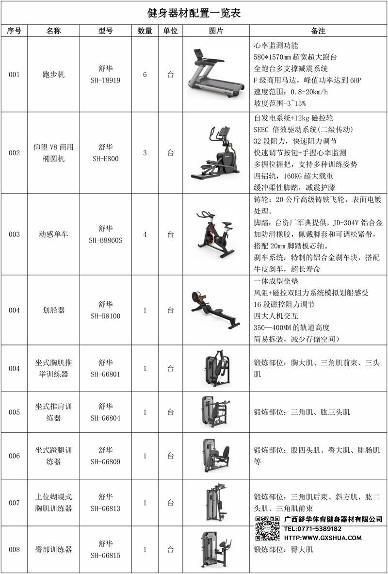 1.suncitygroup太阳集团V9智能跑步机SH-T8919*6台-独立仪表-简洁大气,全新外观设计,健康运动新选择;心率监测功能,可通过手握心率、无线心率带等不同方式实时采集心率数据;580*1570mm超宽超大跑台-跑感舒适,跑台整体安全稳定;全跑台多支撑减震平台,保证跑台超强支撑力,达到180kg支撑,满足专业健身房需求。F级商用马达-超强马达,AC 3.0HP 交流,峰值功率达到6HP,F级商用品质。速度范围达到0.8-20km/h;V9跑步机可实现跑台扬升功能,坡度范围-3~15%,满足客户不同的锻炼需求。